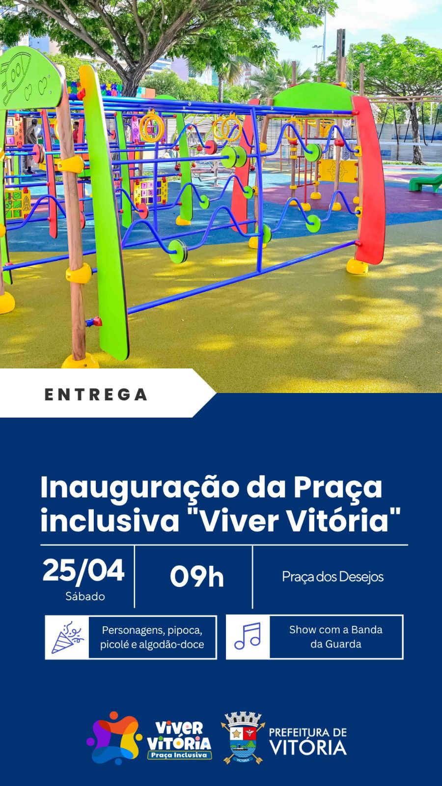 No próximo dia 25 de abril, às 9 horas, será inaugurada a Praça Inclusiva “Viver Vitória”, o 1º Parque Inclusivo do Espírito Santo — um espaço pensado para acolher, integrar e garantir diversão para todas as pessoas, sem exceção.