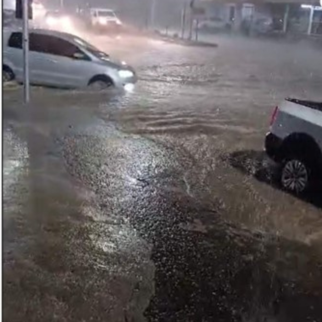 O município sofreu com uma enchente durante a quinta-feira. A força das águas foi tanta que chegou a movimentar carros e moradores precisaram atravessar as ruas a pé, com água na altura do joelho.