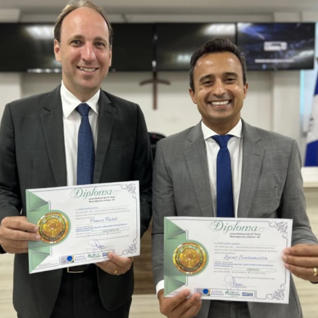 O prefeito eleito Lucas Scaramussa, o vice-prefeito eleito Franco Fiorot (União), os 17 vereadores que comporão a próxima legislatura municipal e os suplentes de vereadores de Linhares foram diplomados pela Justiça Eleitoral na tarde desta segunda-feira (16) na Câmara Municipal.