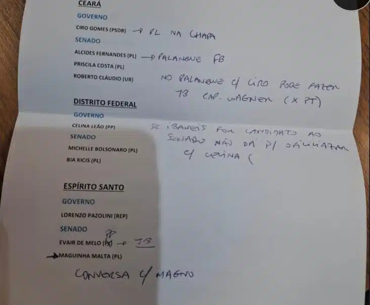 Intitulado “Situação nos Estados”, o documento contém uma série de anotações feitas à mão pelo presidenciável do PL, após ter discutido estado por estado com líderes locais da legenda. Além das estratégias, o registro revela impasses regionais e a avaliação sobre alguns pré-candidatos.