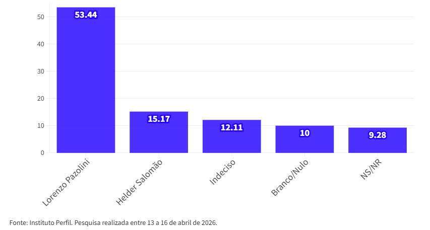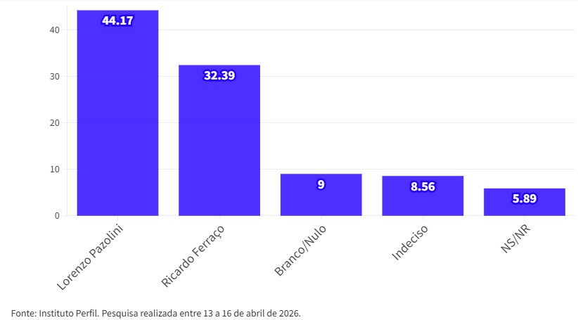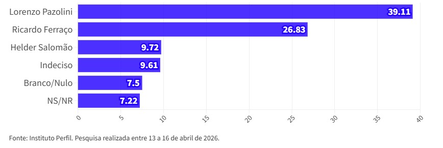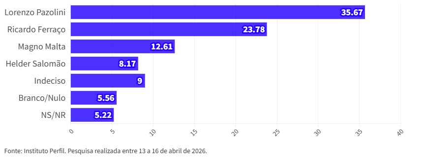 A seis meses das eleições o ex-prefeito de Vitória, Lorenzo Pazolini (Republicanos), lidera pesquisa de intenções de votos realizada pelo Instituto Perfil a pedido de ES Hoje. O nome do republicano aparece com 35,67%, seguido do governador Ricardo Ferraço (MDB), que seria votado por 23,78% dos eleitores que responderam o levantamento.