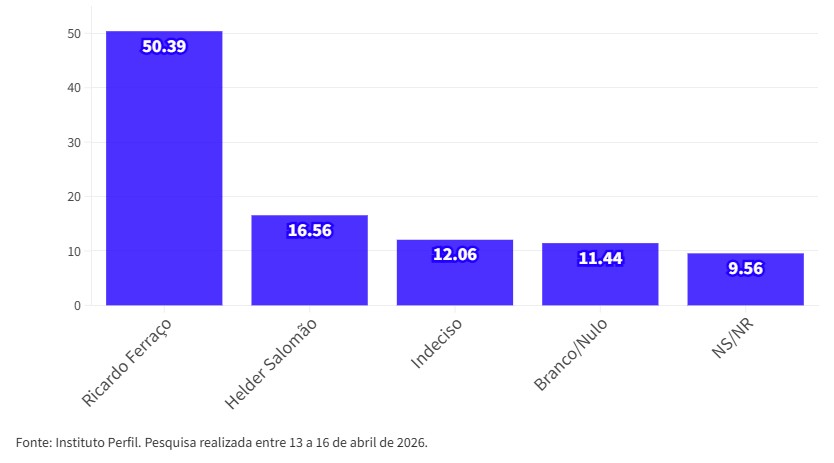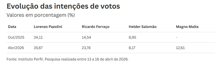 A pesquisa foi realizada com 1,8 mil entrevistas em 50 cidades. A margem de erro é de 2,3% para mais ou para menos e o grau de confiança do estudo é de 95%. Ela está registrada na Justiça Eleitoral com o número ES-04143/2026.