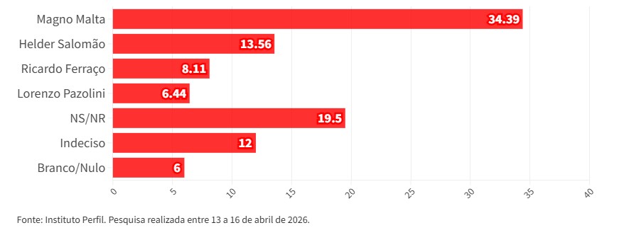 O nome do senador Magno Malta (PL), que não confirmou a decisão do partido por uma candidatura própria, aparece na terceira colocação, à frente do deputado federal Helder Salomão (PT).