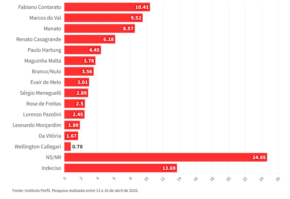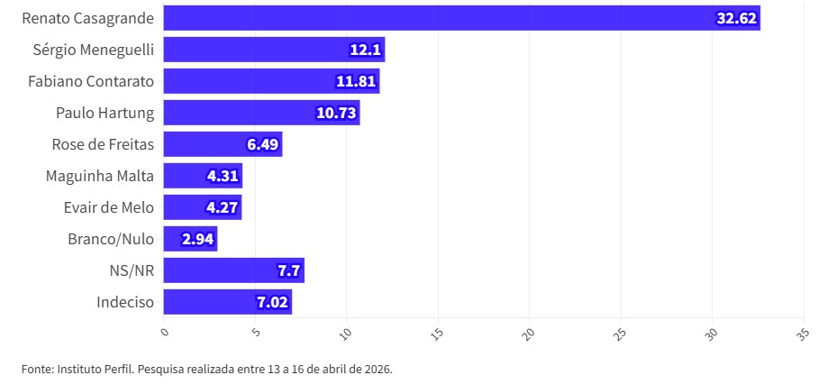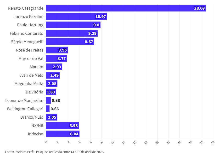 Nas eleições 2026 os eleitores votarão em dois nomes para o Senado. Por isso, na lista apresentada pelo Instituto Perfil os eleitores puderam escolher dois políticos e, ainda assim, nenhum outro nome alcançou o percentual de Renato Casagrande: 28,98%. A segunda posição ficou Pazolini (10,97%), seguido por Paulo Hartung (9,8%), Contarato (9,29) e Sergio Meneguelli (8,67%).
